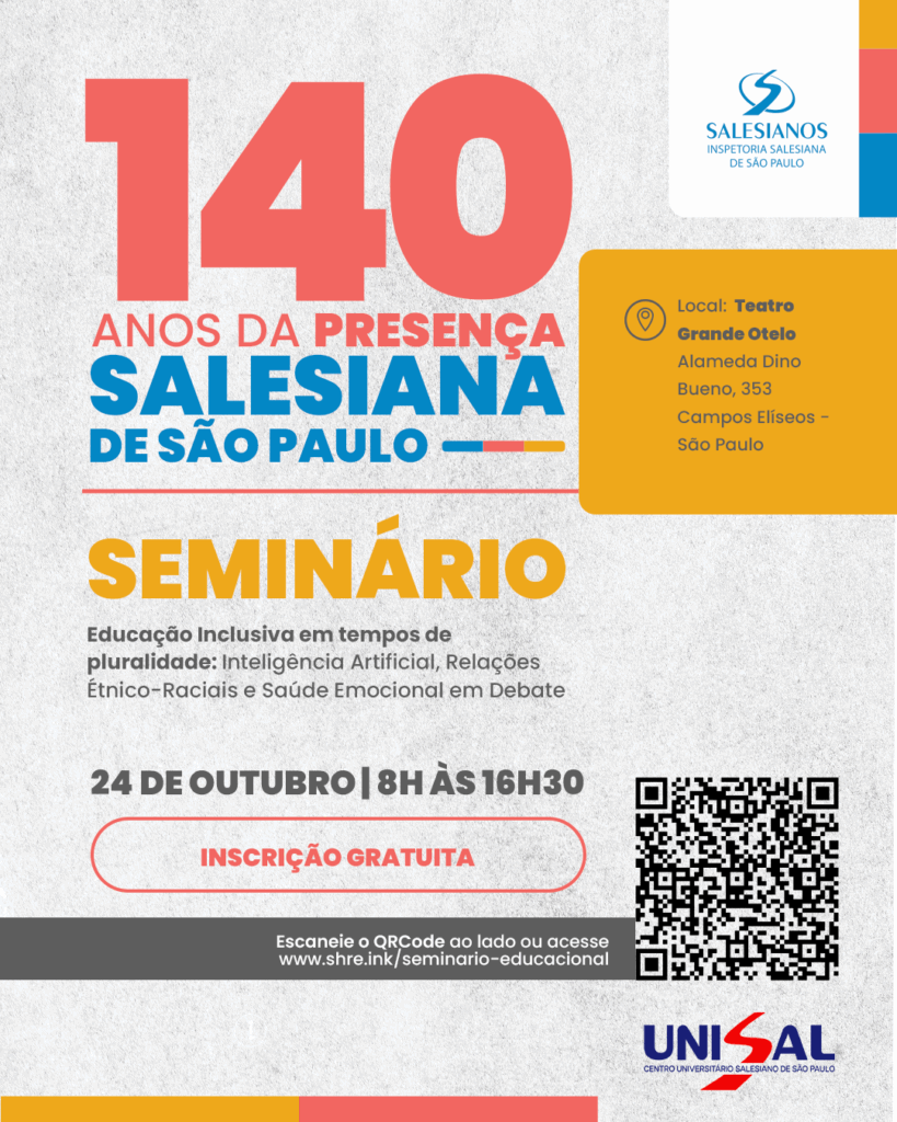 Em comemoração aos 140 anos da presença Salesiana em São Paulo, será realizado o Seminário: “Educação Inclusiva em tempos de pluralidade: Inteligência Artificial, Relações Étnico-Raciais e Saúde Emocional em Debate”, um evento gratuito que propõe reflexões contemporâneas sobre os desafios e possibilidades da educação.