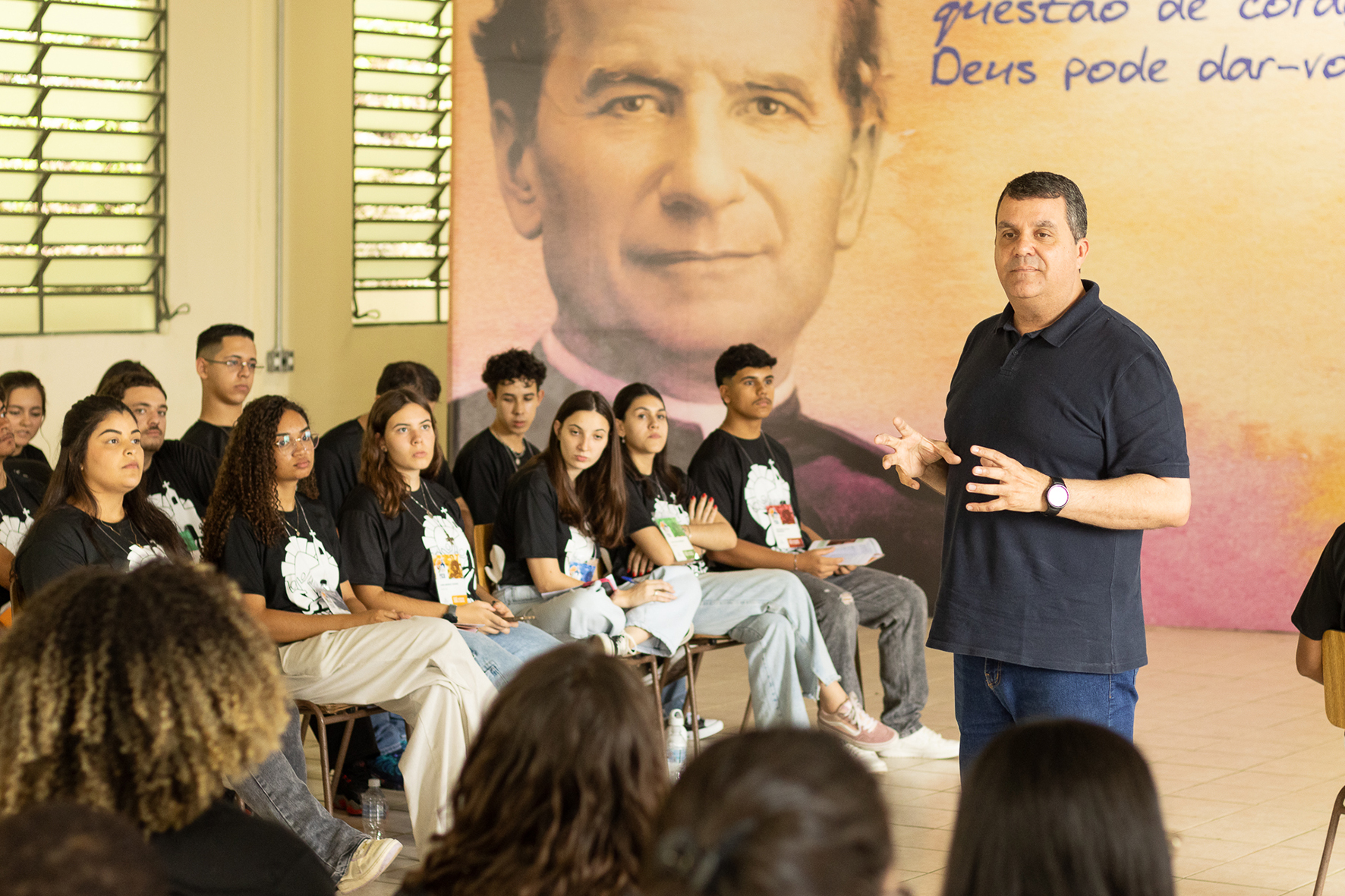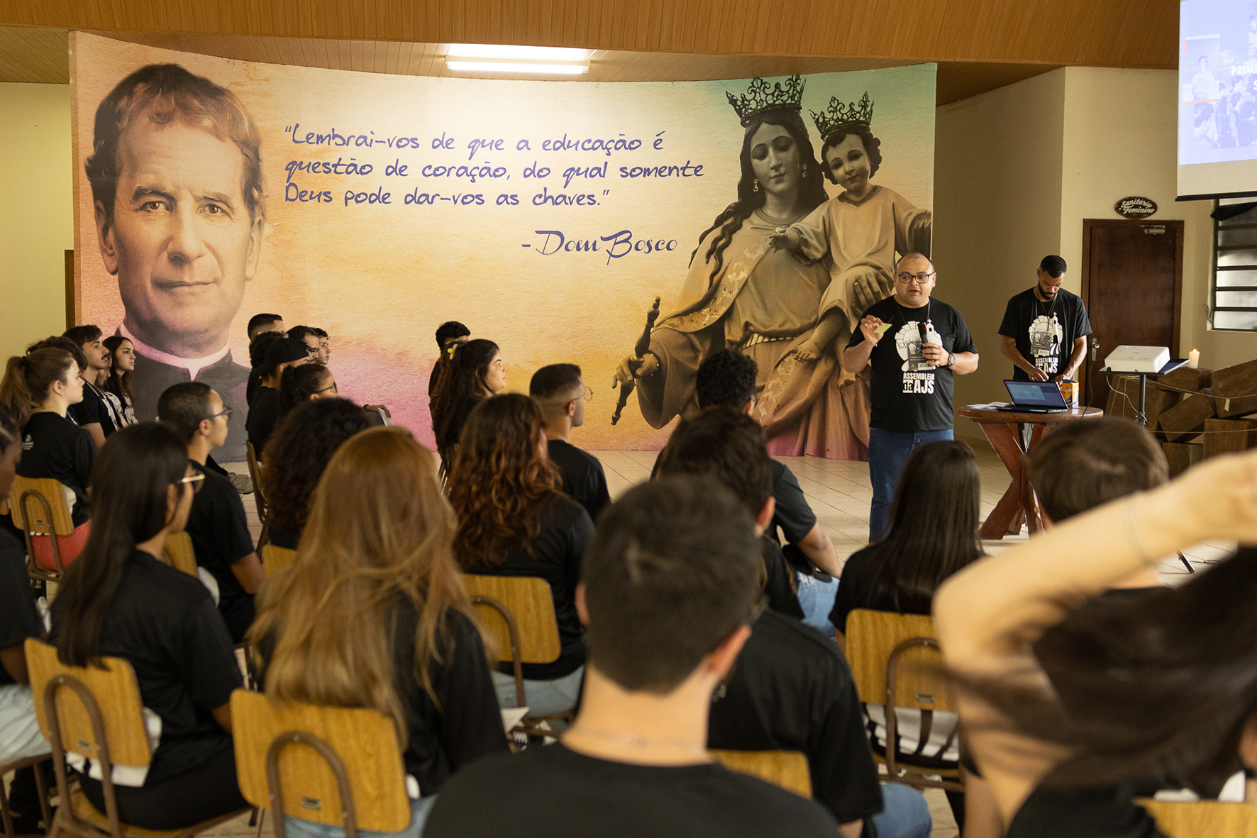 A oração inicial, conduzida pelos salesianos Marcelo Augusto e Wilbertty Silva, criou um ambiente de mística juvenil e preparou o grupo para o primeiro momento formativo. Em seguida, Padre Mauricio Tadeu Miranda, vice-inspetor, desenvolveu a reflexão “Casa, Escola, Igreja e Pátio: Vivendo o Oratório com Dom Bosco”, destacando os pilares do ambiente salesiano e a importância de redescobrir o oratório como estilo de vida e missão.