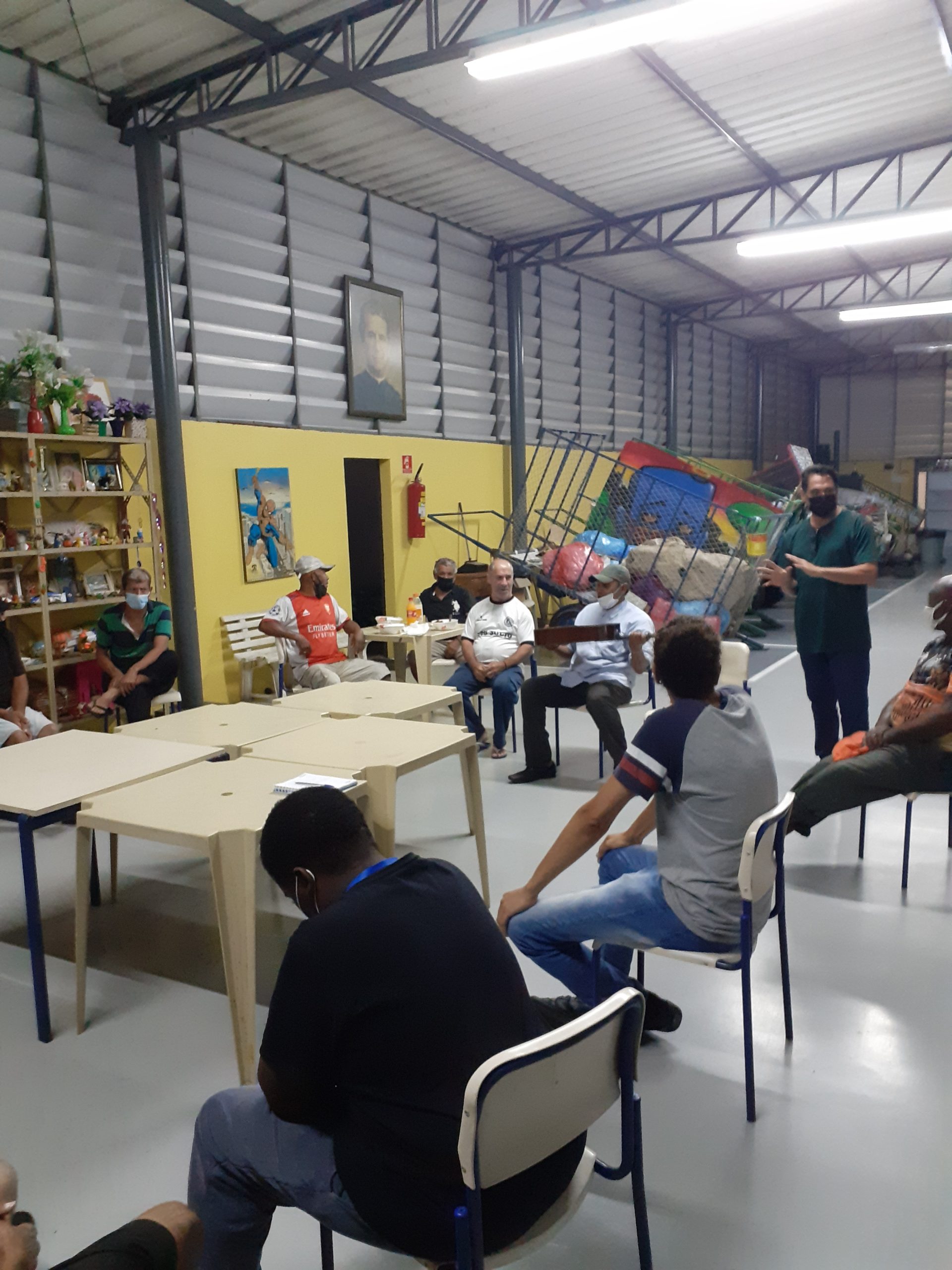 No dia 01/02/22 tivemos uma roda de conversa com os moradores do Abrigo, através de uma interação com um violão restaurado que foi resgatado do lixo, onde o instrumento foi passado de mão em mão para terem uma associação e compartilharem o momento, no encerramento cantamos todos juntos um mantra de harmonia e amor!
