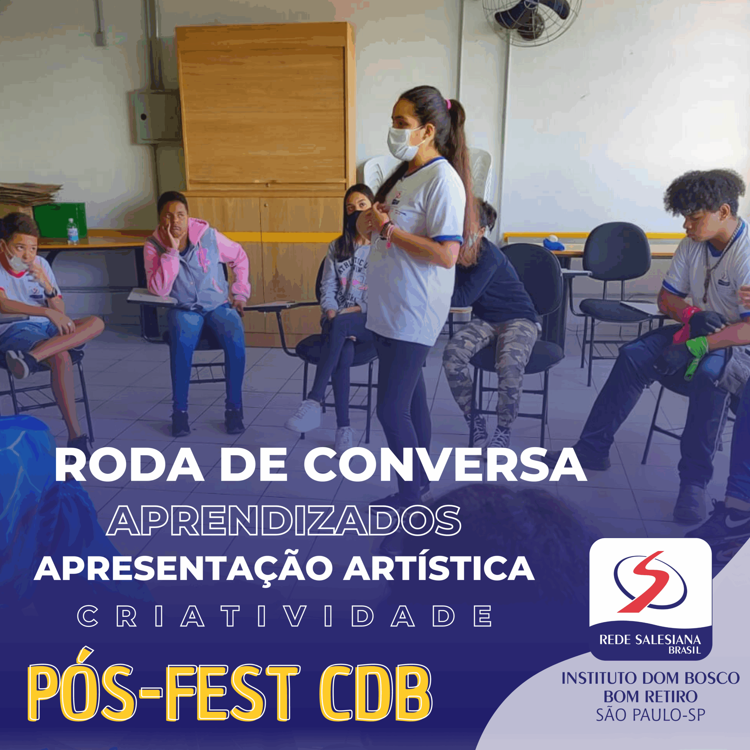 No dia 16 de novembro, com o objetivo de trabalhar a temática do Fest – “E a força da paz junta todos outra vez! (…) Venha já é hora de acender a chama da vida” com os educandos do CJ e CCA do Castelinho Dom Bosco Cidade Ademar – Instituto Dom Bosco, a equipe de Pastoral, junto com os Educadores da Unidade e com a participação de: Aline Candido (Conselho AJS), Gabriel da Costa (Educando de Logística e GAM), Luiz Fernando (Voluntário e Vocacionado) e Alexsander Martins (Oratório, GAM e Voluntário) realizaram uma roda de conversa e apresentação artística com a temática.