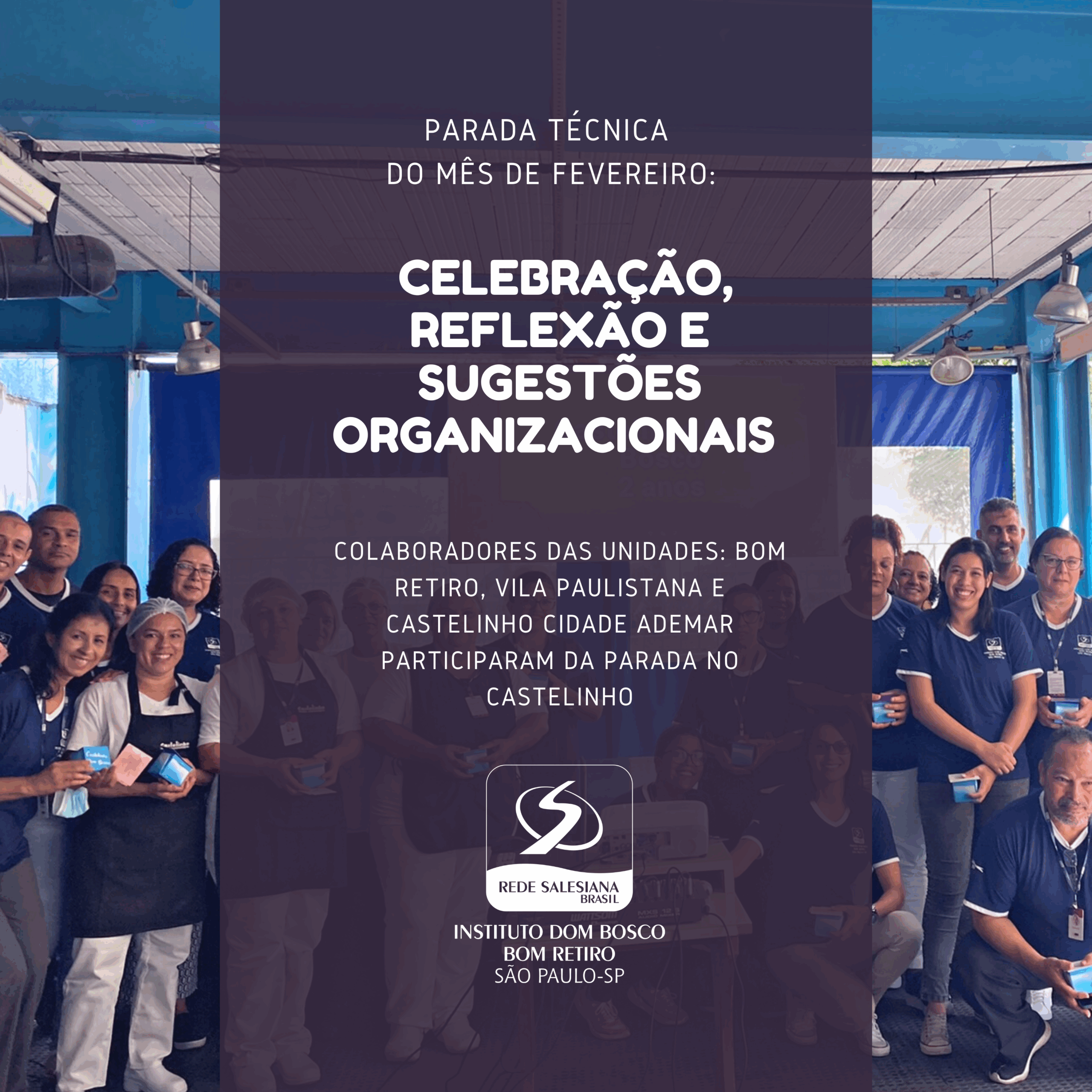 No dia 22 de fevereiro foi realizada a Parada Técnica do Instituto Dom Bosco. Neste mês, a Parada foi realizada no Castelinho Dom Bosco – Cidade Ademar, Zona Sul, em comemoração ao aniversário da Unidade no primeiro dia do mês. Estiveram presentes os Educadores da Unidade Bom Retiro e Vila Paulistana. O momento formativo contou com a fala de Raimundo Lopes de Assis e Fabiano Souza Martins, Aspirantes Salesianos junto a equipe de Pastoral, trazendo o momento de ressignificação pós-carnaval.