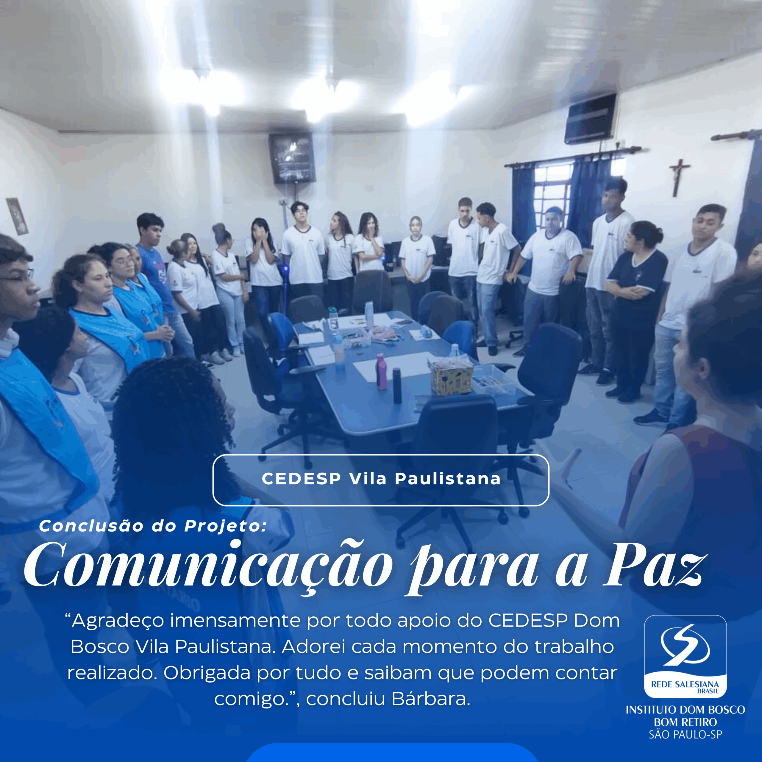 Entre agosto e, agora com conclusão em novembro, toda as sextas-feiras foi dia de formação em Comunicação para a Paz no CEDESP Dom Bosco Vila Paulistana. Com o desenvolvimento de Bárbara Tomiatti Giancola, Doctoranda en Estudios Internacionales en Paz, Conflictos y Desarrollo, Universitat Jaume I, Castellón – España, Educadores e Educandos da Vila, o objetivo da formação foi promover o desenvolvimento de habilidades da comunicação que contribuam para relacionamentos harmoniosos baseados na Cultura de Paz. A proposta é de reflexão sobre os mecanismos de linguagem enquanto elementos de aproximação ou de geração de conflitos entre familiares, amigos, colegas de trabalho, professor e aluno. Refletir sobre como a paz e a harmonia nos relacionamentos dependem, entre outras coisas, da capacidade de entendimento e compreensão do “outro”, dos seus sentimentos e da sua visão de mundo.