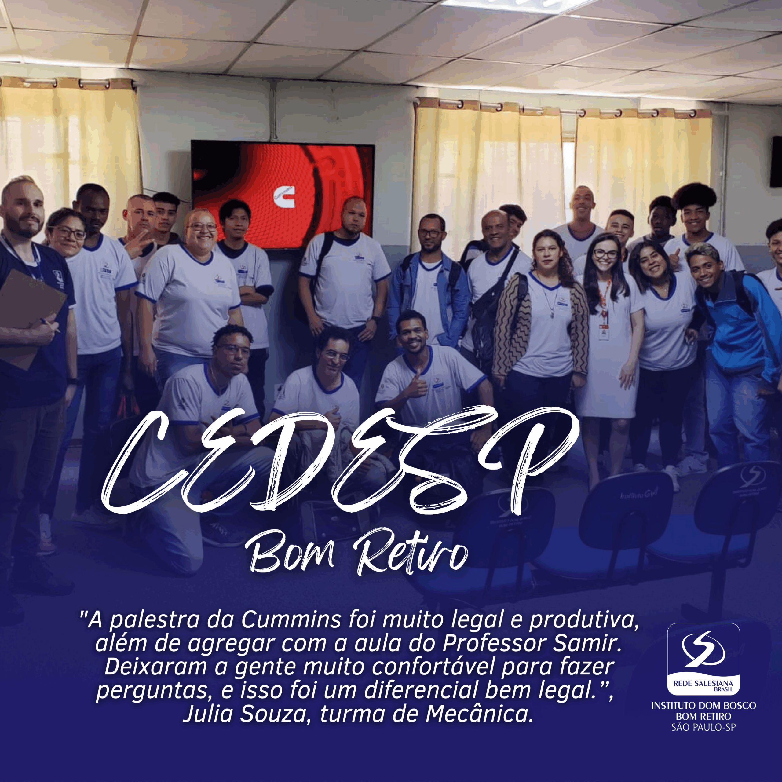 “A palestra da Cummins foi muito legal e produtiva, além de agregar com a aula do Professor Samir. Deixaram a gente muito confortável para fazer perguntas, e isso foi um diferencial bem legal.”, Julia Souza, turma de Mecânica.