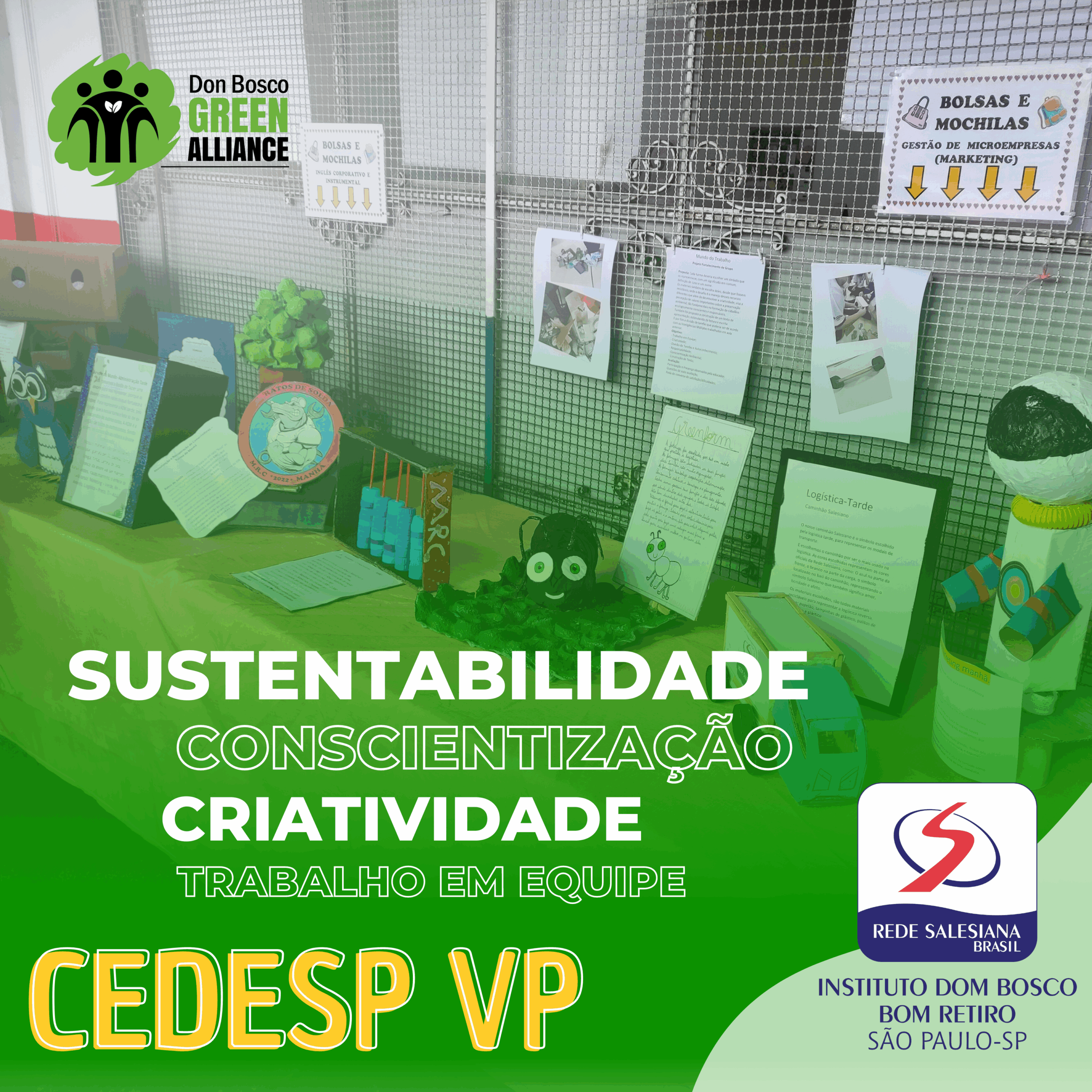 Com o objetivo de desenvolver o trabalho em equipe, criatividade, conscientização ambiental, responsabilidade e autoconhecimento, a Educadora responsável por atividades relacionadas ao Mundo do Trabalho, Flávia Sousa do CEDESP Vila Paulistana, do Instituto Dom Bosco, realizou com as turmas dos cursos de Marketing, MRC, Logística, Administração e Informática a atividade Mundo do Trabalho – Fortalecimento de grupo, durante o segundo semestre do curso. O desafio era que cada turma deveria escolher um símbolo que os representasse, com um significado em comum, definição de cores e um nome. Os materiais foram escolhas deles, desde que fossem recicláveis, onde o desafio é o manejo desses recursos que habitualmente são descartados, além do desenvolvimento da criatividade e a percepção de valores importantes sobre a preservação ambiental, tão fundamentais na formação de cidadãos ecologicamente conscientes e responsáveis. Além disso, foi necessária a elaboração e construção de texto de apresentação deste símbolo, estimulando a leitura e escrita da turma. Por fim, a divisão de tarefas que poderia ser de acordo com as Inteligências Múltiplas trabalhadas em aula anterior.