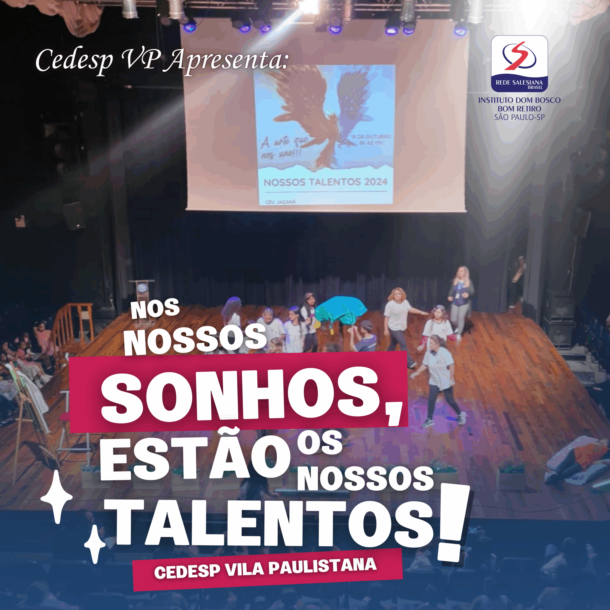 Com o tema “A arte que nos une”, o CEDESP Dom Bosco Vila Paulistana apresentou no dia 18 de outubro o espetáculo: “Nos nossos Sonhos, estão os nossos Talentos!”, o qual foi inspirado pela estreia salesiana 2024: “O sonho que vos faz sonhar”. O evento contou com um público de aproximadamente 650 pessoas, considerando os períodos manhã e tarde. As apresentações foram realizadas no CÉU Jaçanã e foi promovida pelo CRAS JT. O objetivo principal do evento é promover a integração dos educandos da rede socioassistencial, estimular e evidenciar o potencial criativo de crianças, adolescentes, jovens e idosos, atendidos pelos serviços parceirizados com a Prefeitura; além de proporcionar um espaço de valorização e reconhecimento da riqueza cultural.
