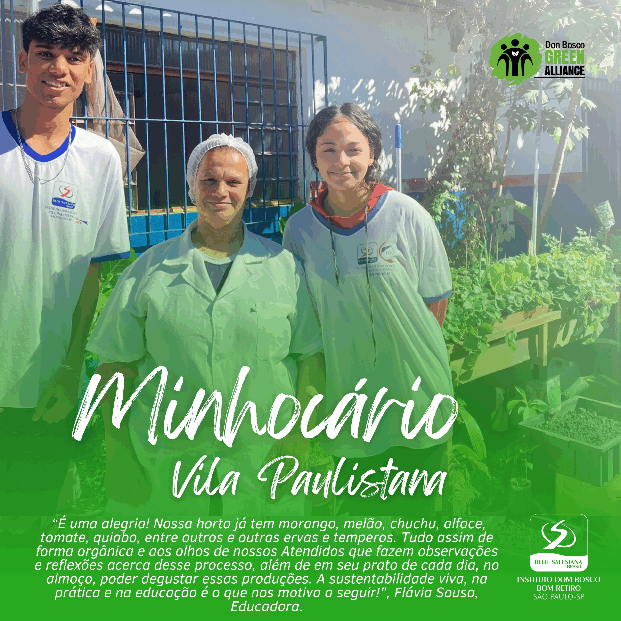 Os jovens e adultos da Obra Social Instituto Dom Bosco, CEDESP Unidade Vila Paulistana, com idades de 15 a 59 anos, realizam durante um semestre cursos de qualificação profissional, onde nas matérias inclui-se formações sustentáveis. Além da grade, os Atendidos são motivados diariamente a práticas ambientais, uma delas: O Minhocário da Vila.