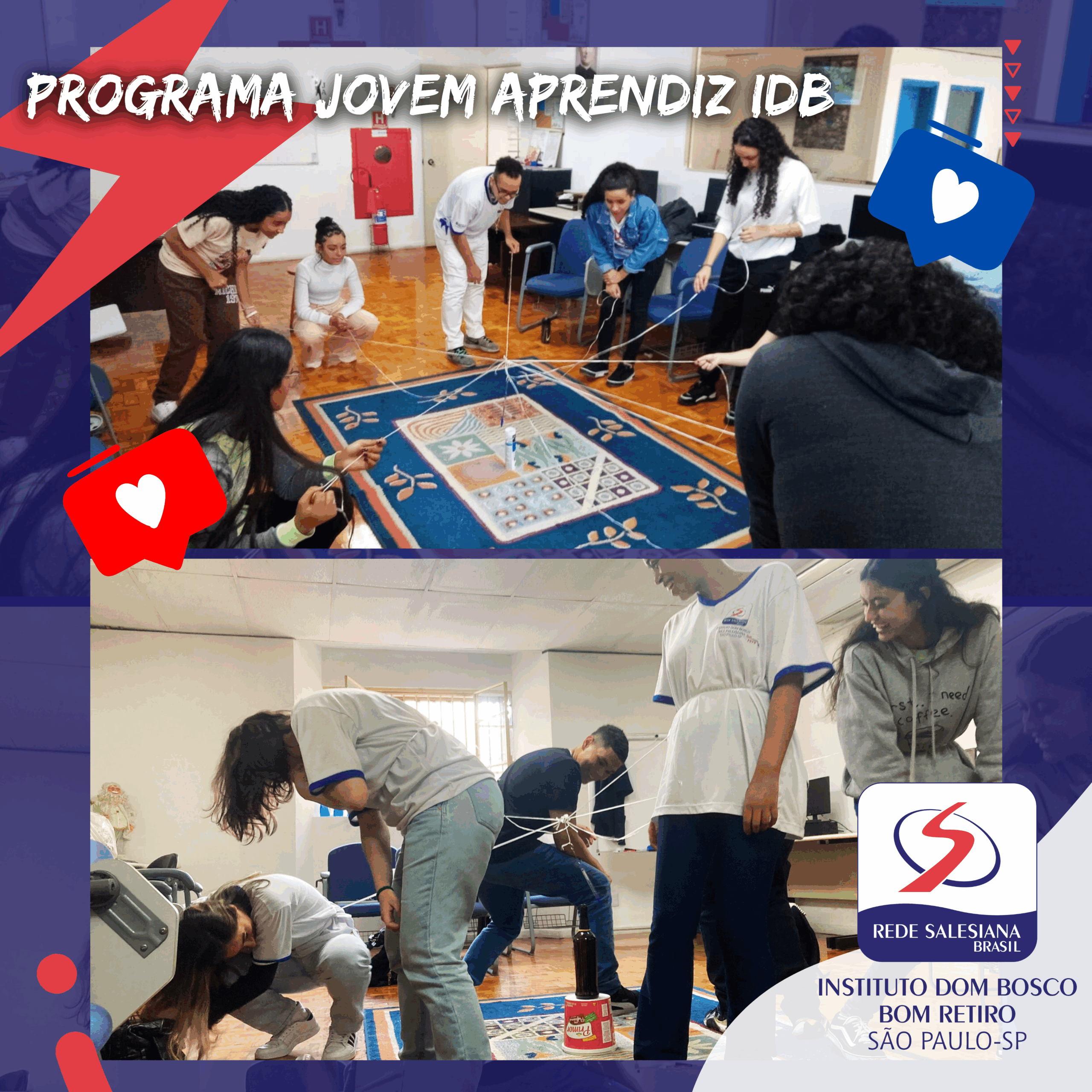 Na semana do dia 28 a turma de Jovem Aprendiz do Instituto Dom Bosco realizou dinâmicas que promovem o trabalho em equipe na prática. “Trabalhar em equipe é um pilar substancial e indispensável.”, declarou Alexandro Mota, Instrutor de Aprendizagem, que, de forma lúdica e animada promoveu o momento. O momento ainda fez alusão ao tripé Salesiano: Amor, Razão e Religião. Nesta semana iniciaram 8 novos jovens no Programa e o momento já é “de cara” um fortalecimento de vínculos.