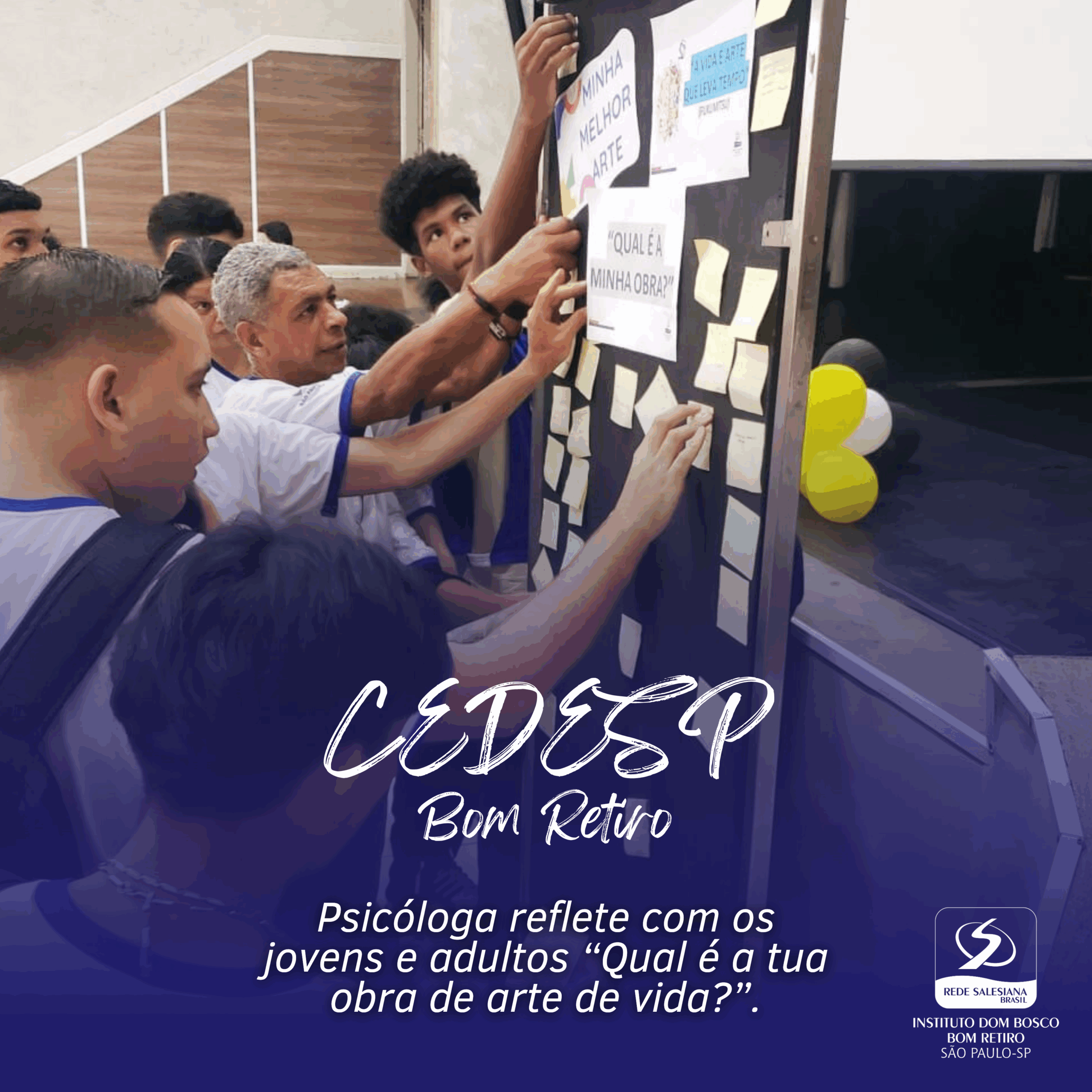 Após se apresentar para a turma do CEDESP Bom Retiro, a Psicóloga Monique Carvalho do Instituto Dom Bosco, realizou um momento de bom dia e boa tarde em homenagem ao Dia do Artista (24/08) e Dia Nacional das Artes (12/08), a pergunta foi: Qual é a tua obra?/Qual é a minha obra de arte de vida?”. Em uma reflexão conjunta com os educandos, Monique, visou maior conscientização sobre a importância da arte e do artista em nossas vidas, desenvolvimento e para sociedade. Também, gerou maior aproximação e interação entre os educandos, além de promover espaço de voz, escuta, trocas e partilhas potentes, mesmo que em breve momento, acerca do sentido e significado de arte e de vida para cada um, compreendendo juntos, que arte é música, pintura, teatro, cinema, dança, fotografia, literatura, circo, obras e esculturas e que psicologia além de ciência e profissão também é arte enquanto instrumento de trabalho como ponte de expressão, e que portanto, arte é sermos e existirmos nas infinitas possibilidades que temos como obras que vão sendo pintadas, desenhadas e construídas a cada pincelada de fase de vida e sendo assim, entendemos que a vida também é arte, arte que construímos em cada passo dado de nossa caminhada pela vida, com diferentes modos e formas de se viver, sentir, pensar, agir e de existir e que para tudo isso leva-se um tempo, onde é necessário um mínimo autoconhecimento voltado para o que desejamos realizar e ou construir enquanto obra de arte de vida ou para o que já realizamos e construímos.