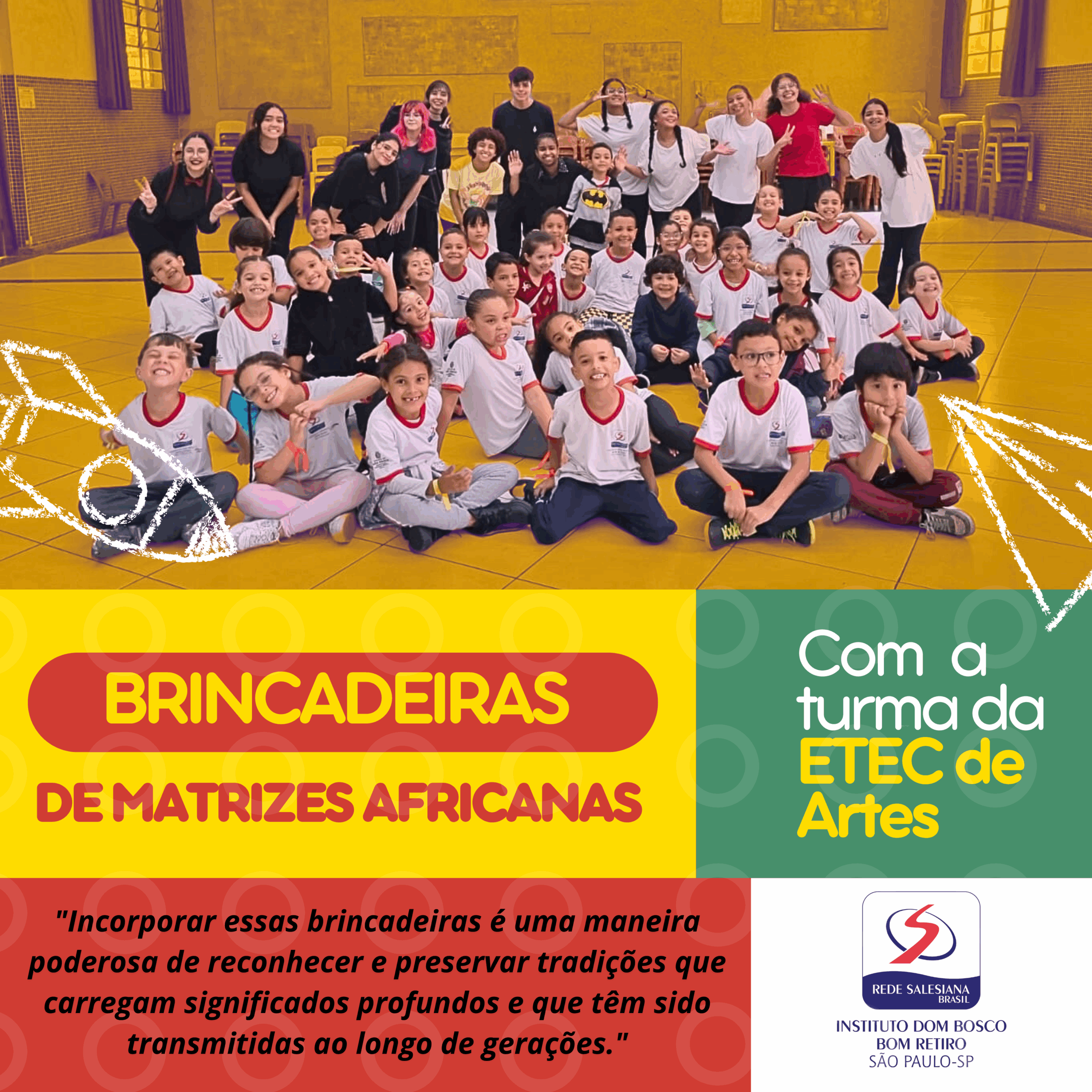 Nesta segunda (04), a Turma A do 1ºAM do curso de Eventos da ETEC de Artes, juntamente com a Professora Valéria dos Reis, estiveram no Instituto Dom Bosco realizando o evento recreativo com o CCA PROVIM Bom Retiro. O tema proposto foi: “Brincadeiras de Matrizes Africanas”, como uma forma de celebrar e valorizar a rica herança cultural de povos africanos e suas influências na diáspora. Para os alunos: “Incorporar essas brincadeiras é uma maneira poderosa de reconhecer e preservar tradições que carregam significados profundos e que têm sido transmitidas ao longo de gerações.”